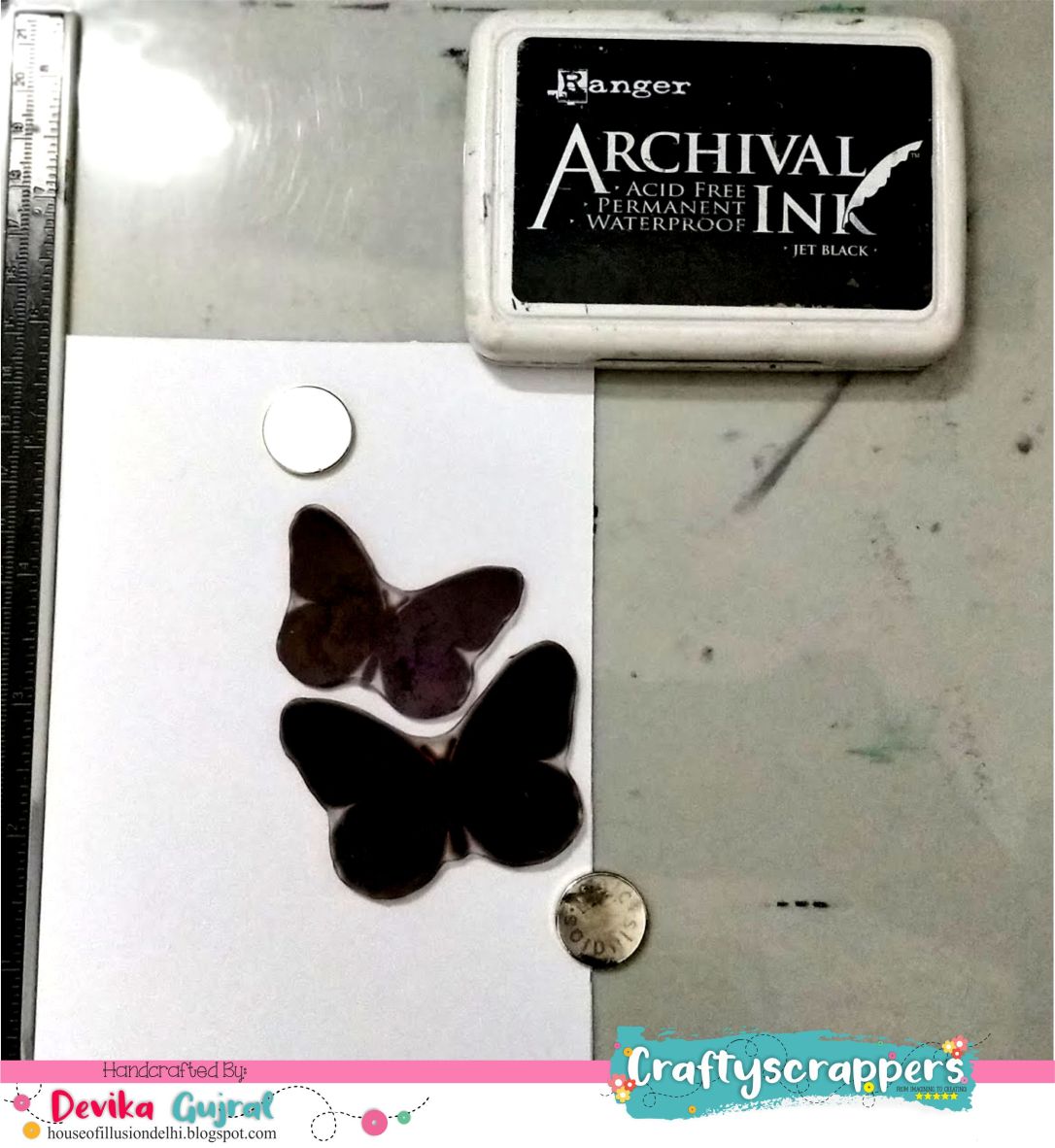- Stamp the outline, solid butterfly image from the Birthday Flutters Craftyscrappers stamp set using Black Archival ink.